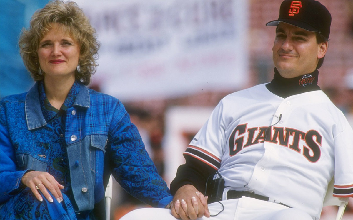 Dave Dravecky, mantan pitcher Major League Baseball, berjabat tangan dengan fans dalam seragam San Francisco Giants.