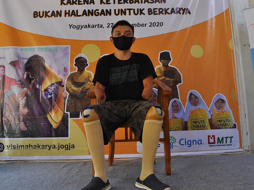 “Saya difabel karena kecelakaan tersengat listrik ketika kerja. Sekitar tahun 2013, waktu itu saya umur 19 tahun”. Ucapnya saat ditemui seusai penyerahan bantuan kaki palsu oleh Yayasan Visi Mahakarya, di Kampung Sidikan, Yogyakarta, Minggu, 27 Desember 2020.