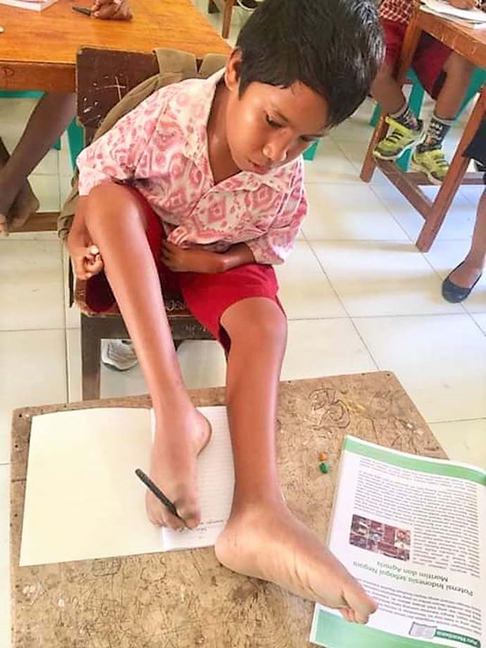 Untuk aktifitas mandi, gosok gigi dan BAB, ibunya yang penuh perhatian tetap membantunya. Kalau di sekolah, ia sering dibantu oleh teman-temannya atau gurunya.